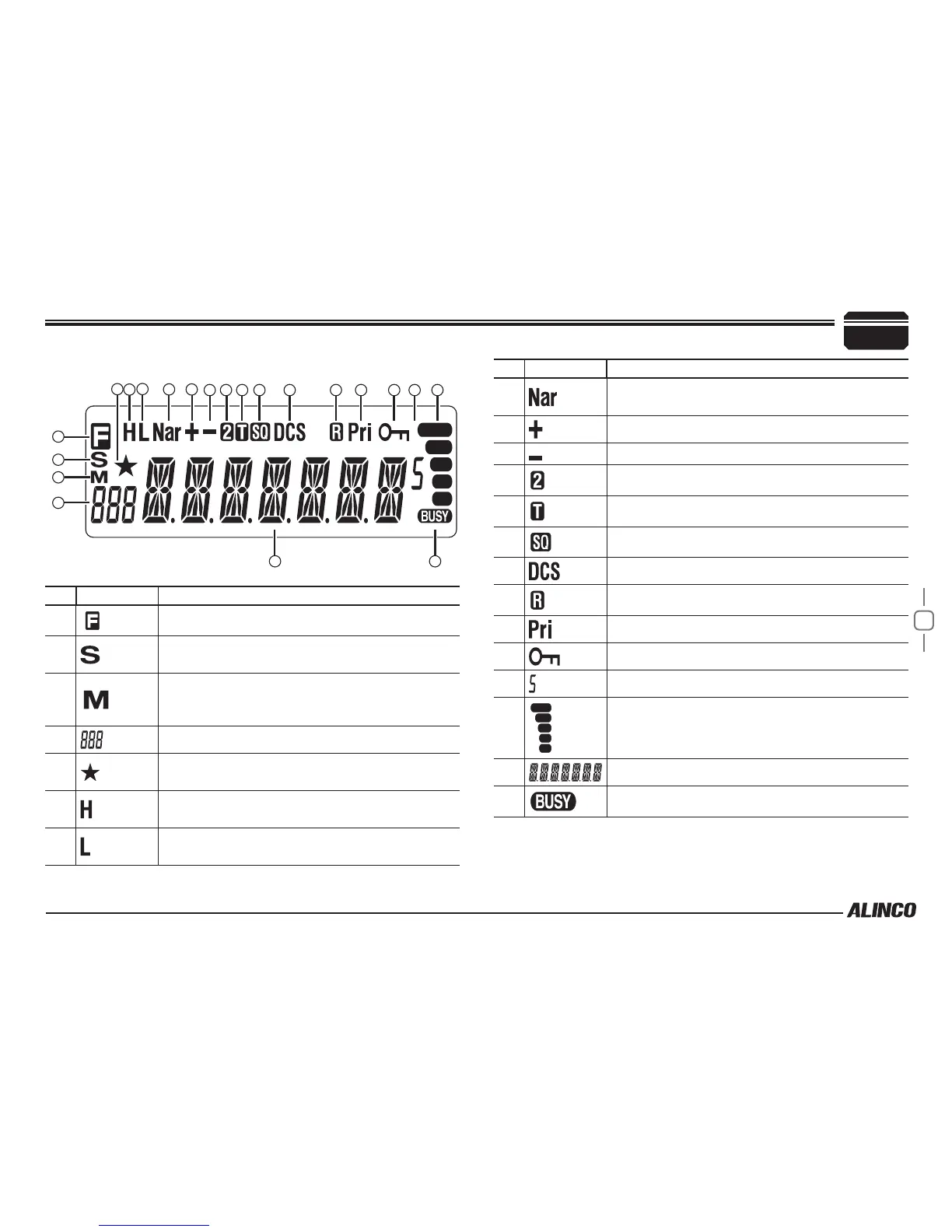 14 Lights up when DCS (Digital Coded Squelch) is set.