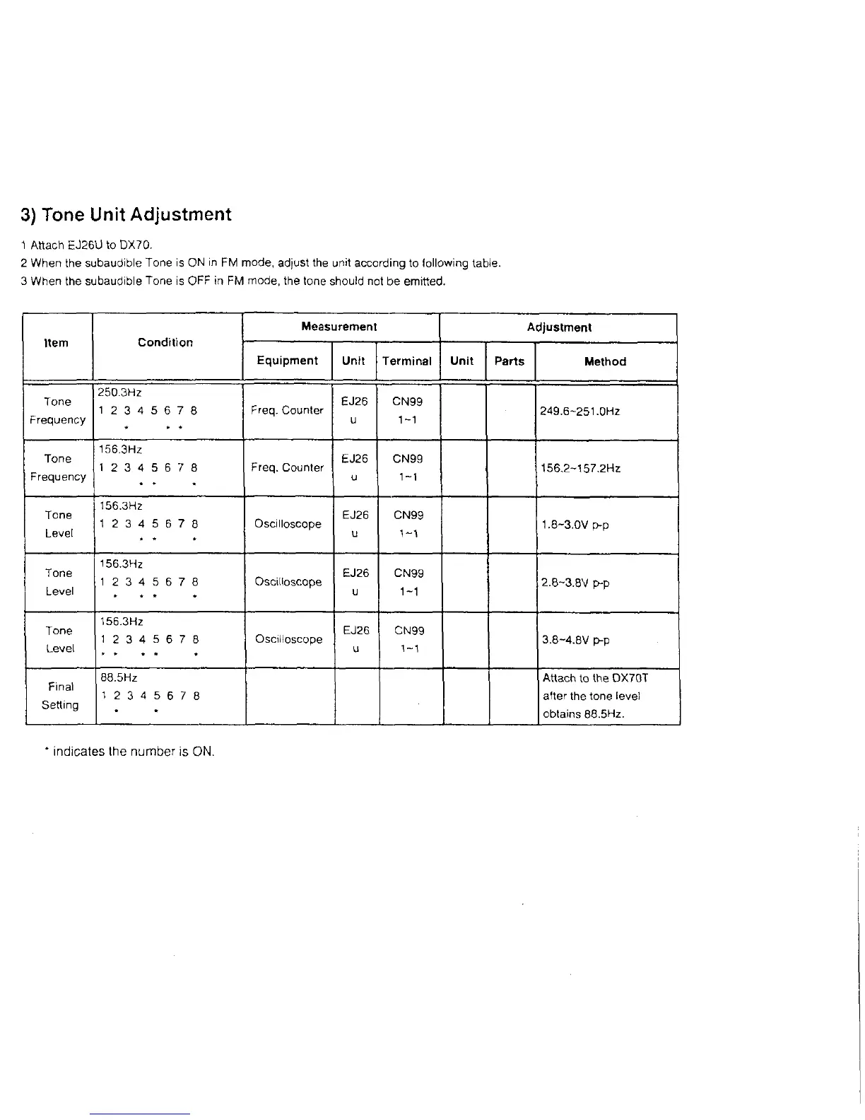 2 When the subaudible Tone is ON in FM mode, adjust the unit according to following table.
