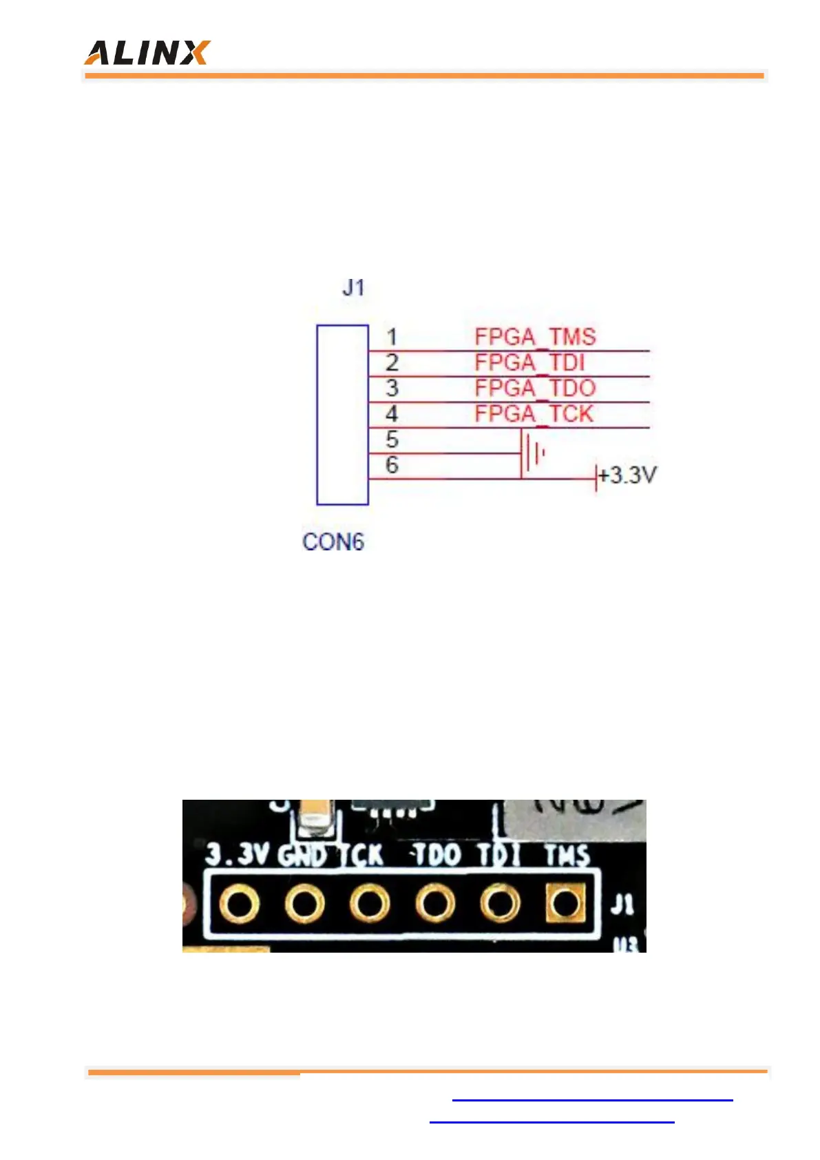 The JTAG interface J1 on the core board uses a 6-pin 2.54mm pitch single-