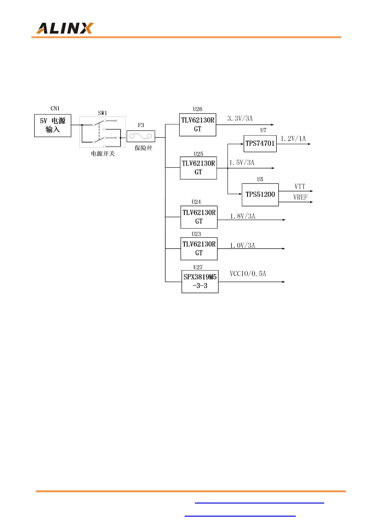 The development board is powered by +5V and converted to +3.3V, +1.5V,