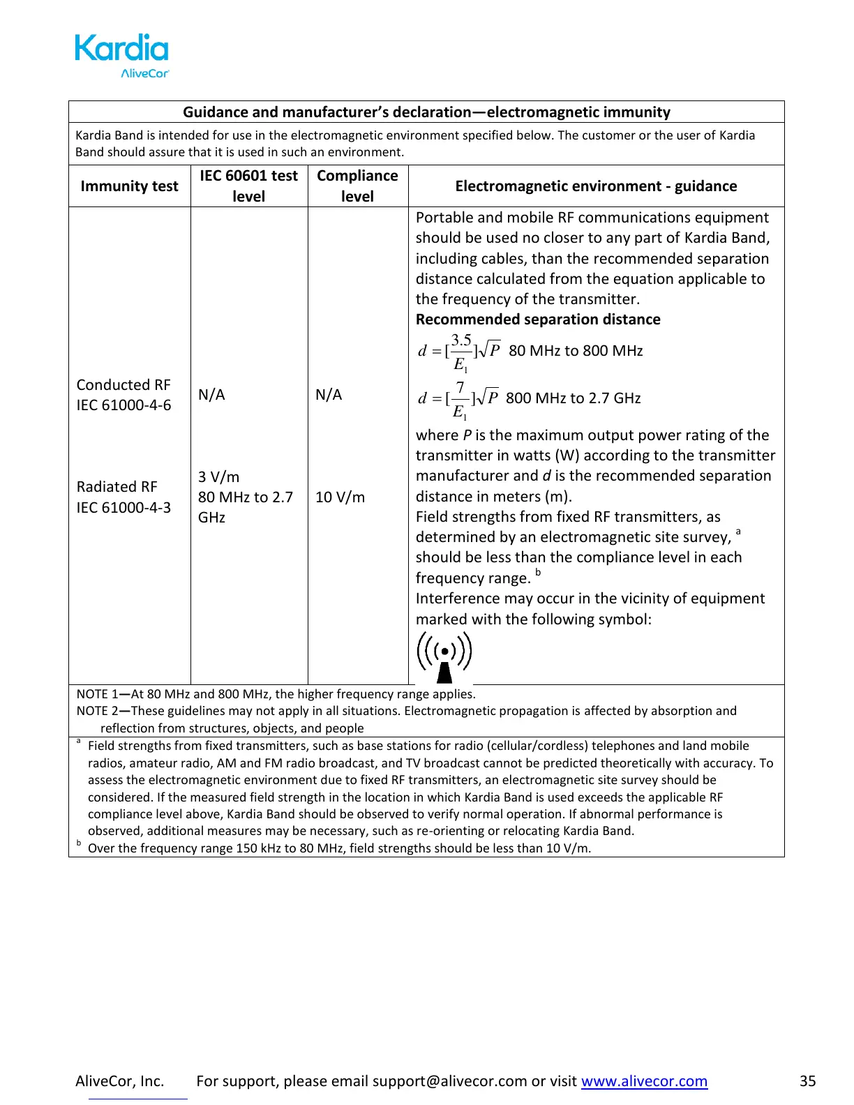 considered. If the measured field strength in the location in which Kardia Band is used exceeds the applicable RF