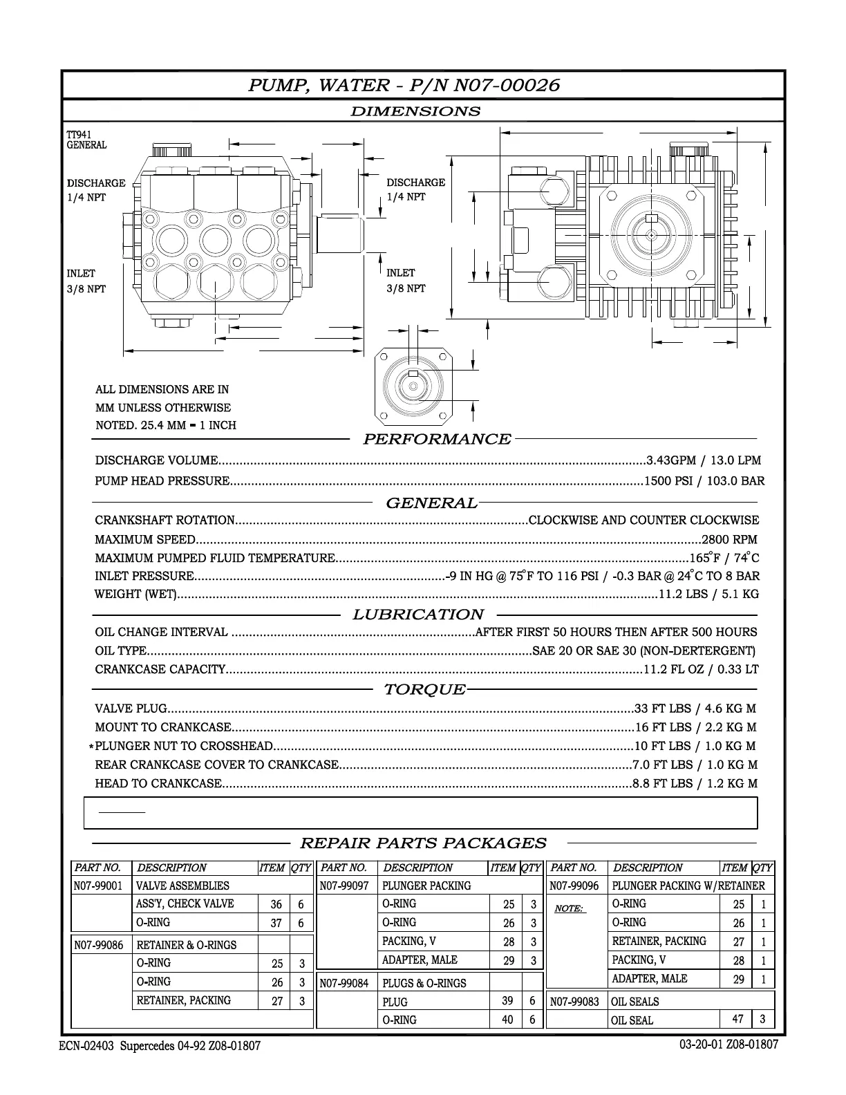 ALKOTA 2142 - Water Pump Specifications; Dimensions & Performance; Lubrication & Torque; Repair Parts Packages