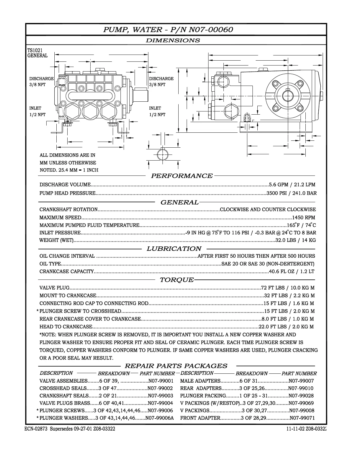 ALKOTA 4142 - PUMP ASSEMBLY DETAILS; Pump Dimensions; Pump Performance Metrics; Pump Lubrication & Torque