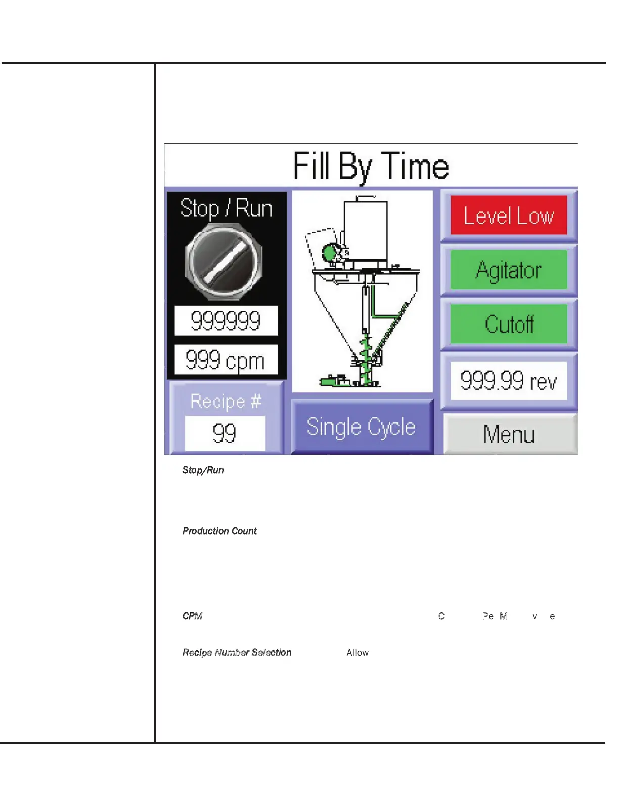 The Main screen provides operational control of the filler, as well as displaying machine produc-