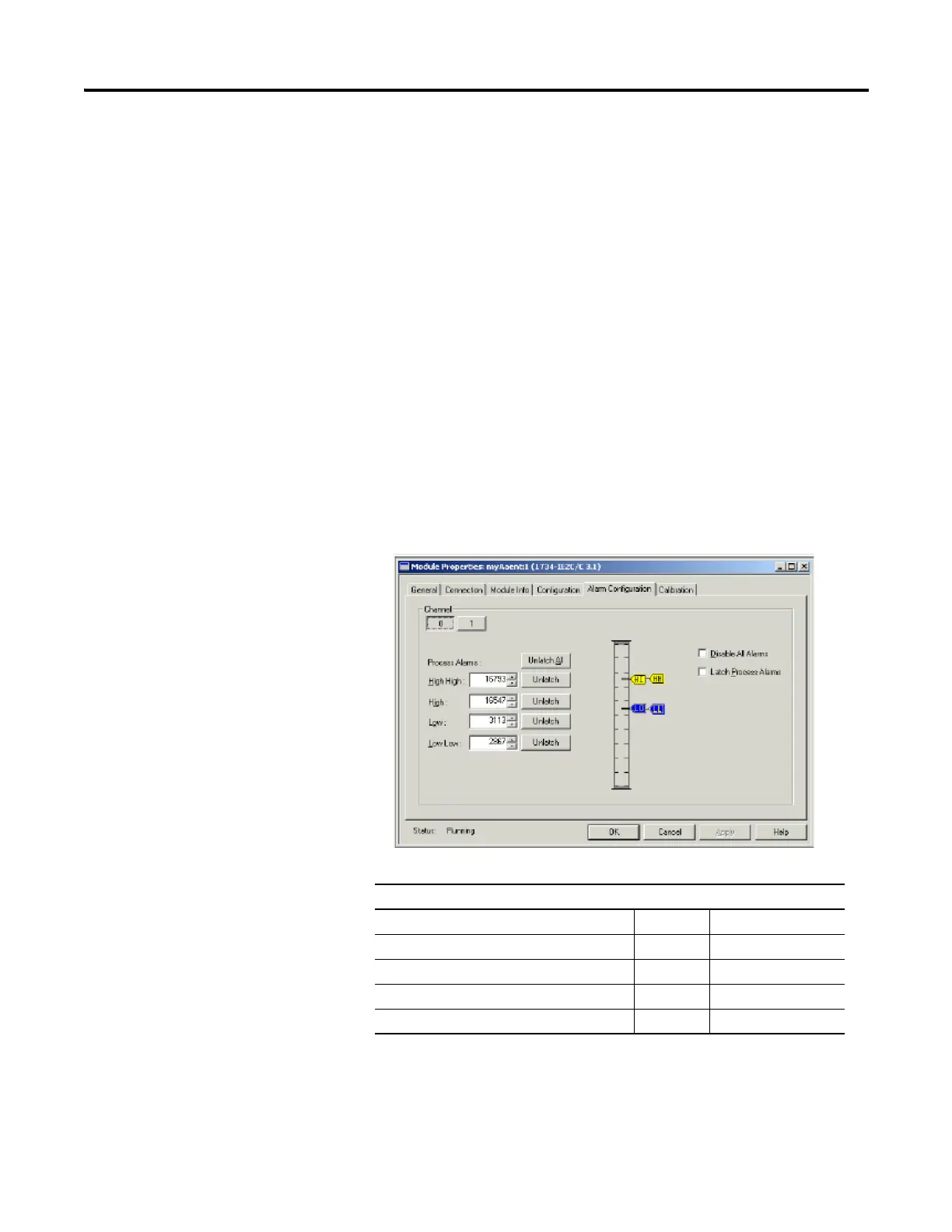 You see an Alarm Configuration dialog for a current or voltage module,