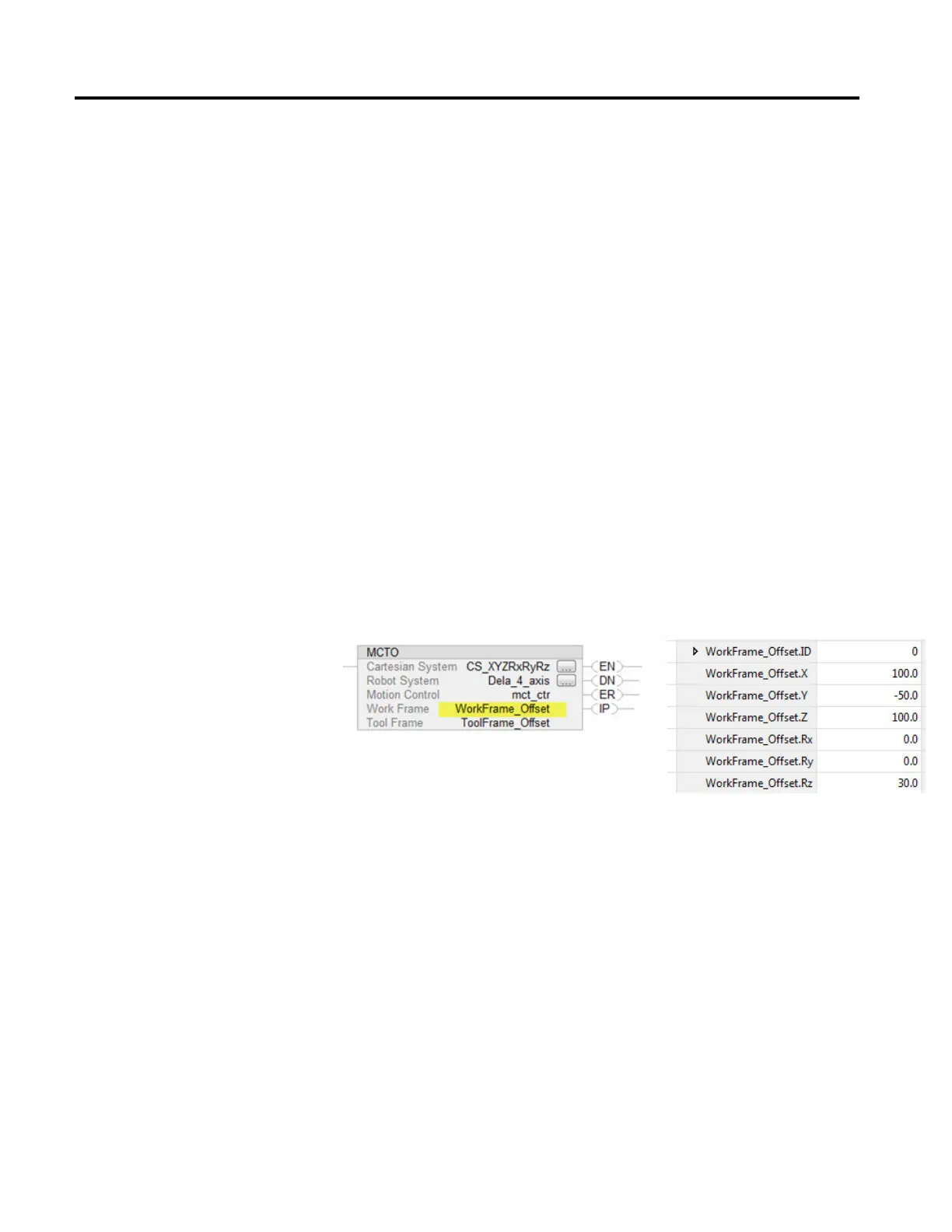 Configure the work frame offsets in the MCTO or MCTPO instruction in Logix
