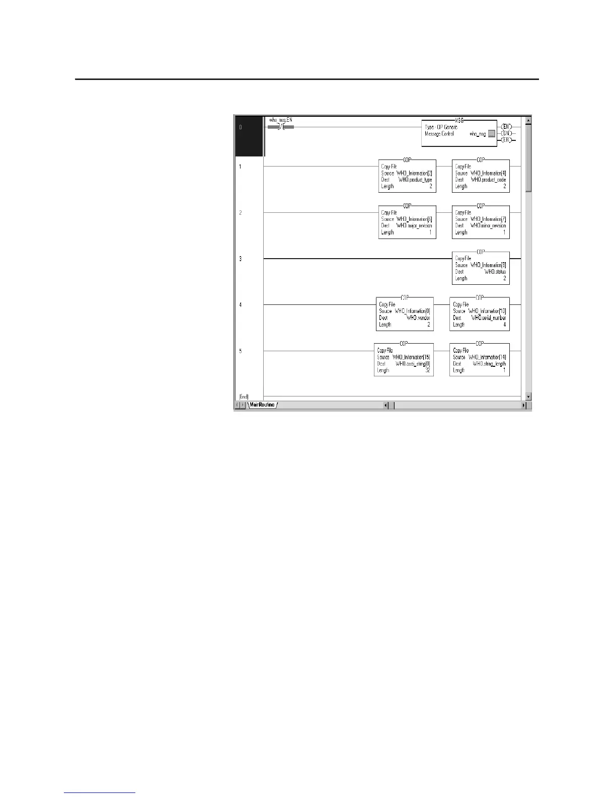 • Rung 5 extracts the module’s ASCII text string and the length of the text