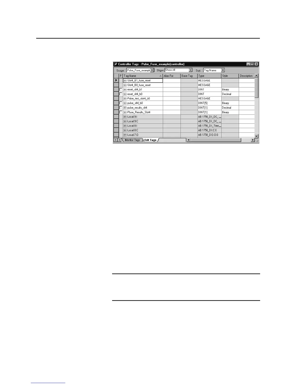The Controller Tags dialog box shows examples of the tags created in the ladder