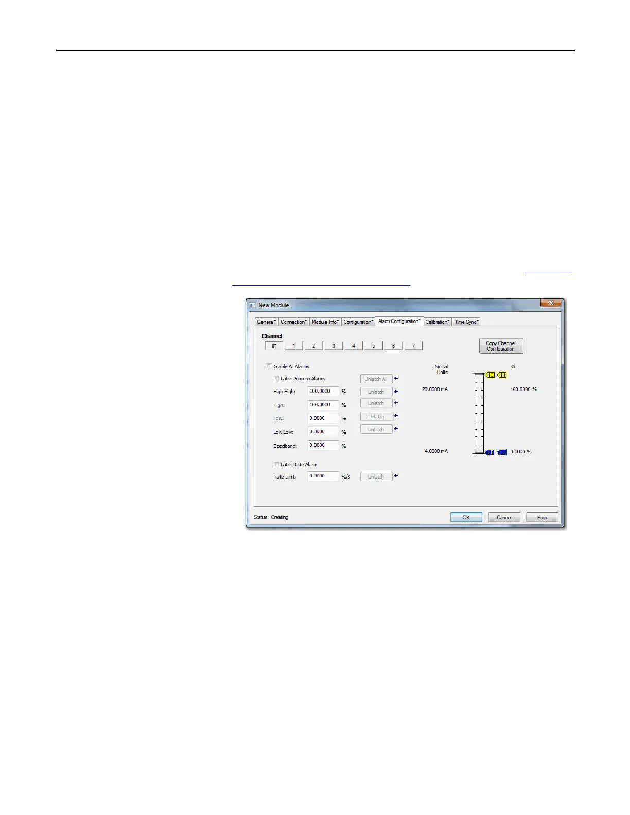 Alarm Configuration tab are specific to the module type. The following are