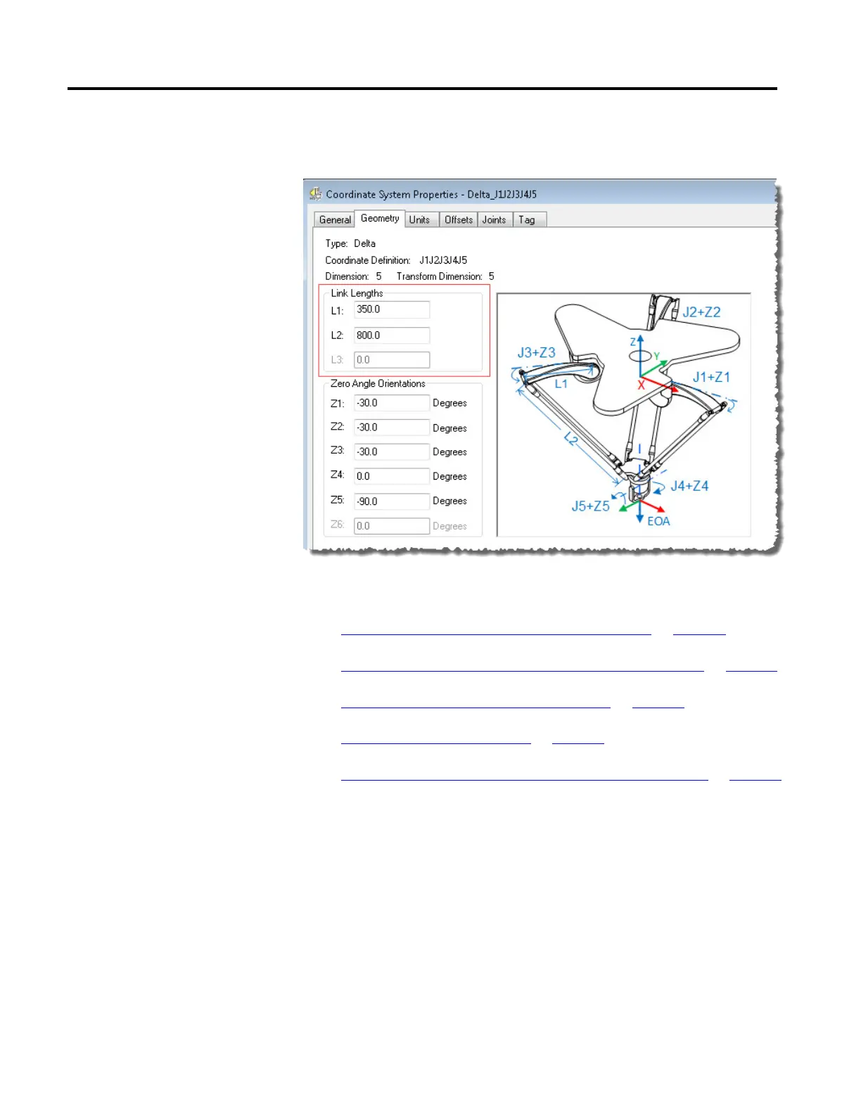 Enter the link lengths on the Geometry tab in the Coordinate System
