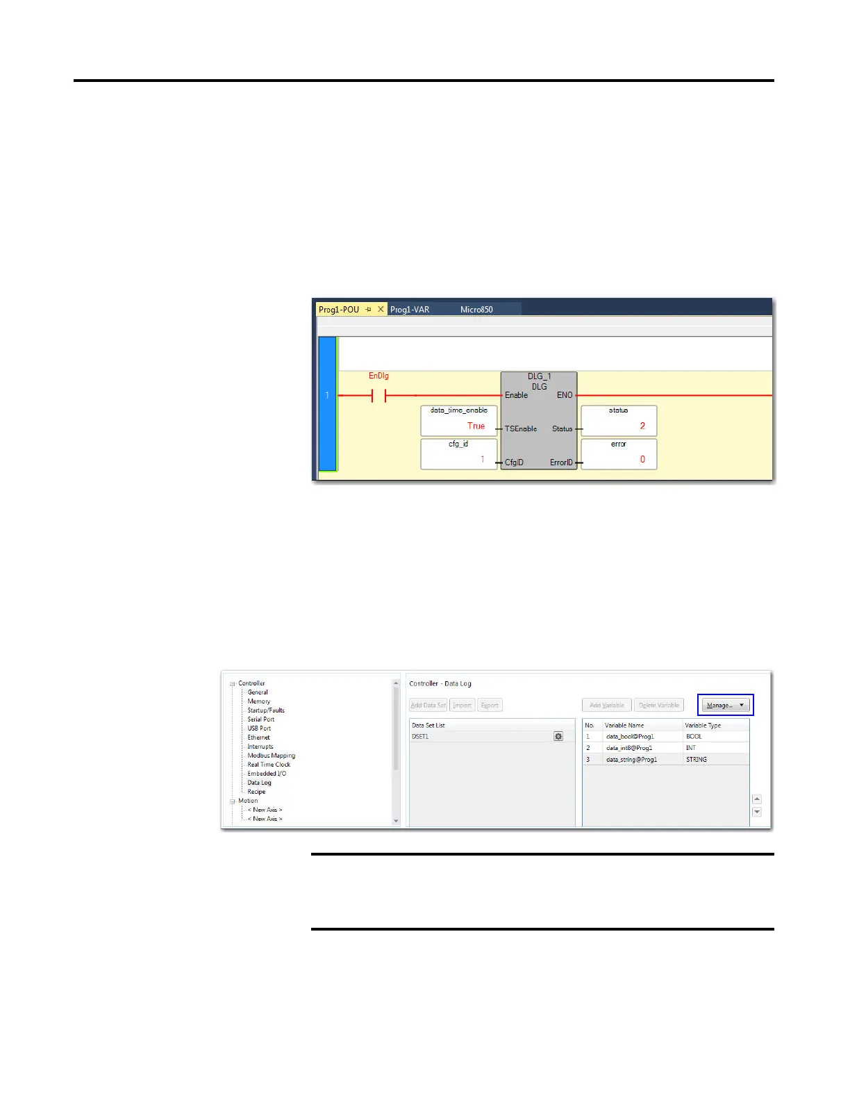Execute the DLG function block. Notice the Status output go from 0 (Idle) to