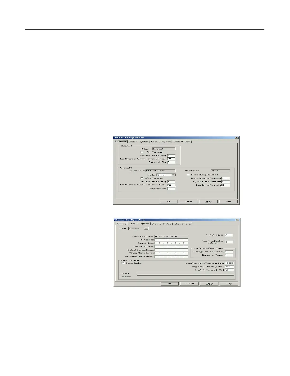below, followed by the Channel 1 System configuration page with the Pass