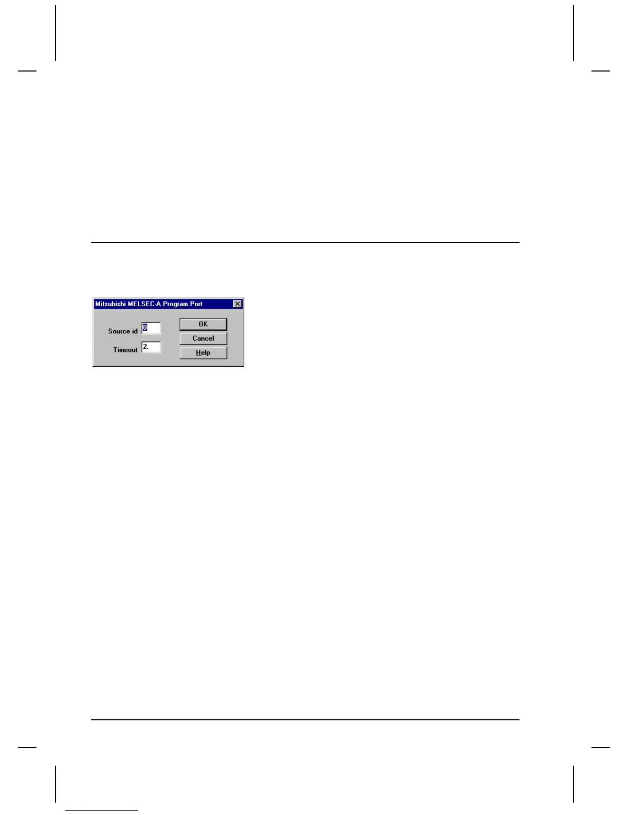The drawing shows the setup dialog box for Mitsubishi MELSEC-A Program Port. The default setting