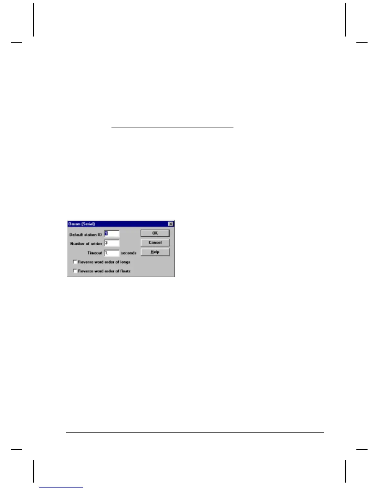 The following drawing shows the Omron protocol setup dialog box. Enter the Default station ID (PLC