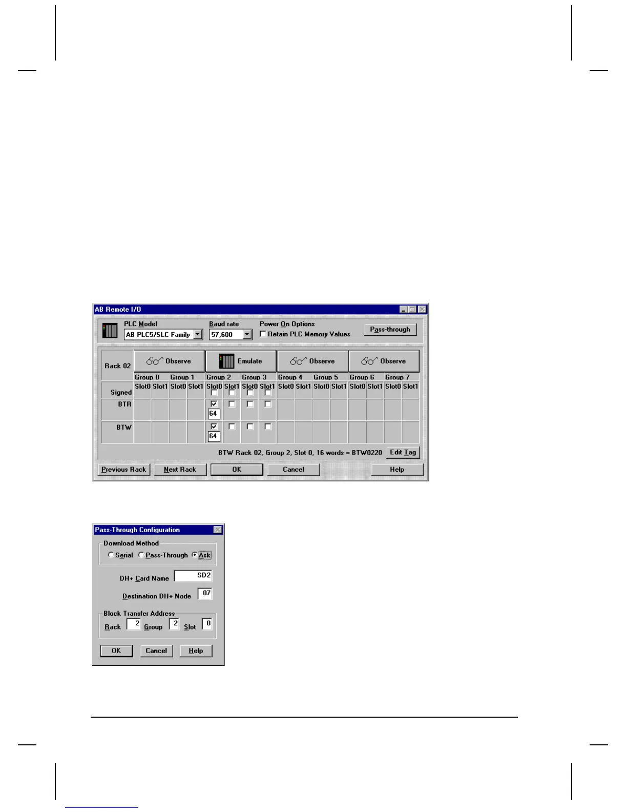 display the AB Remote I/O configuration dialog box. Select the PLC type and the Baud rate of the