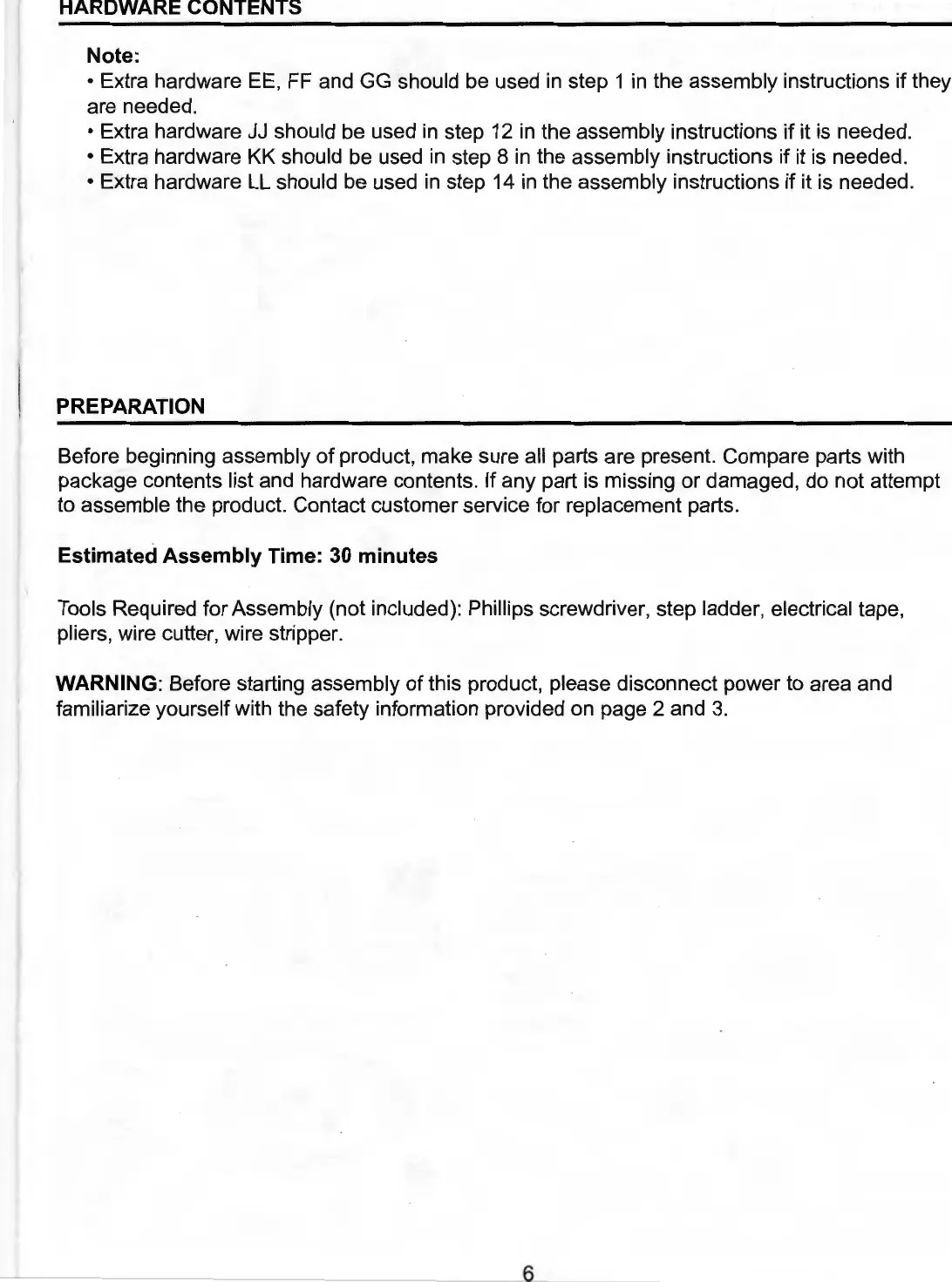 Tools Required for Assembly (not included): Phillips screwdriver, step ladder, electrical tape,