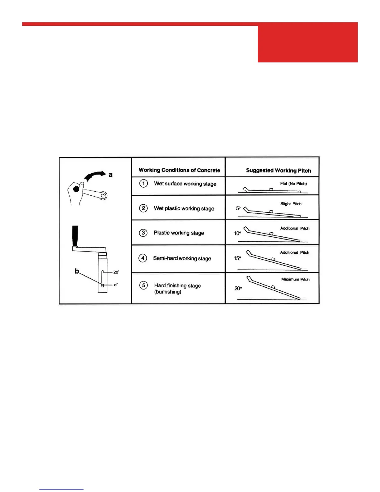 Different pitch angles are needed as you work the different stages of the concrete. Refer to fi gure be-