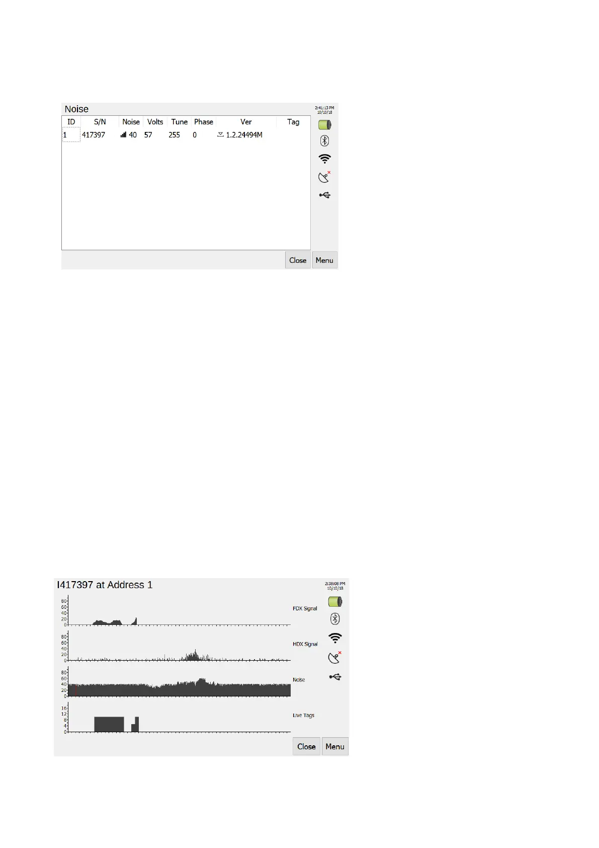 To view real time noise, signal strength and tag reads data you can press on noise value on the