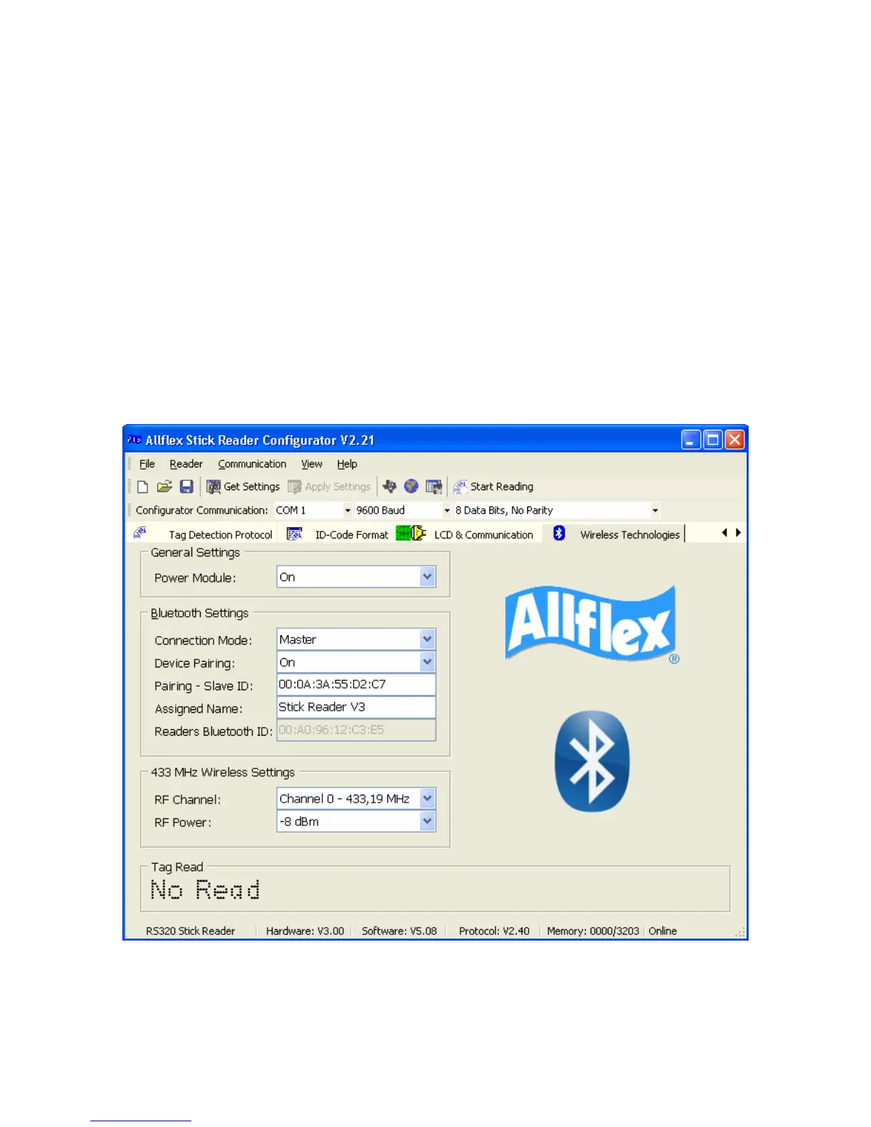 Start the Configurator© software and turn on the reader. The reader’s current settings