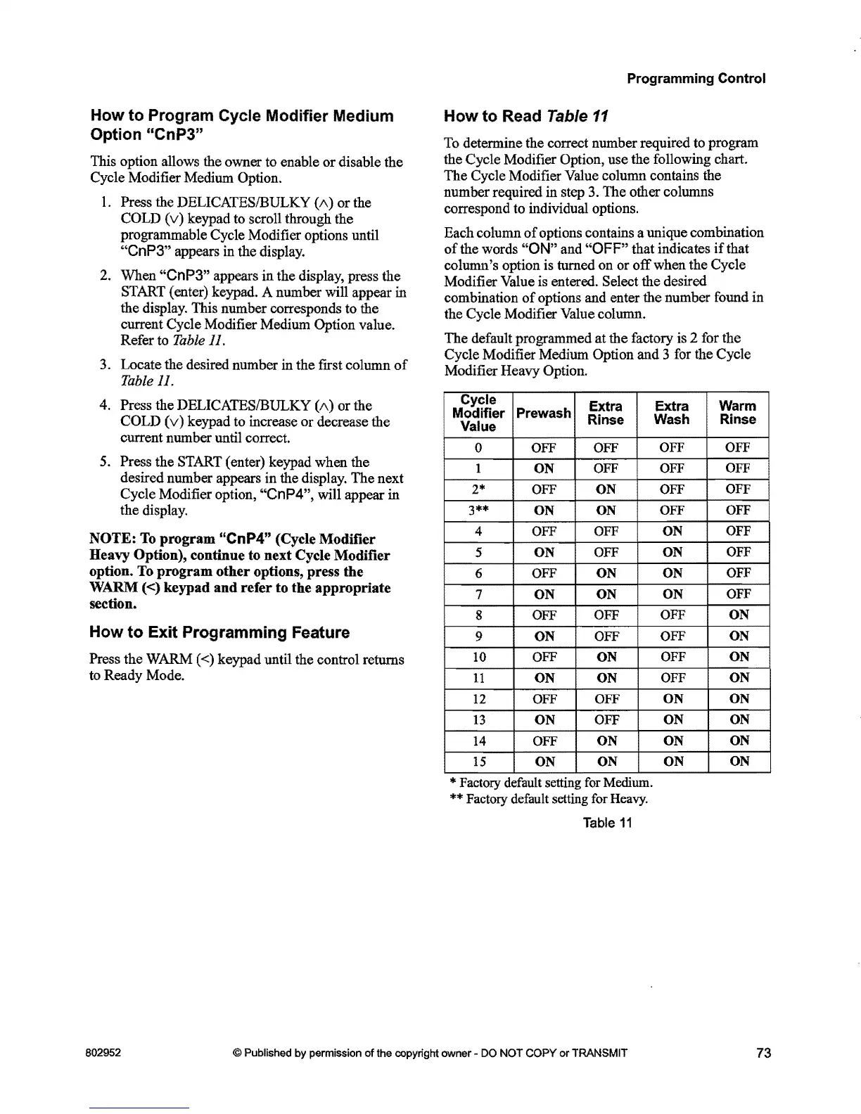 the Cycle Modifier Option, use the following chart.