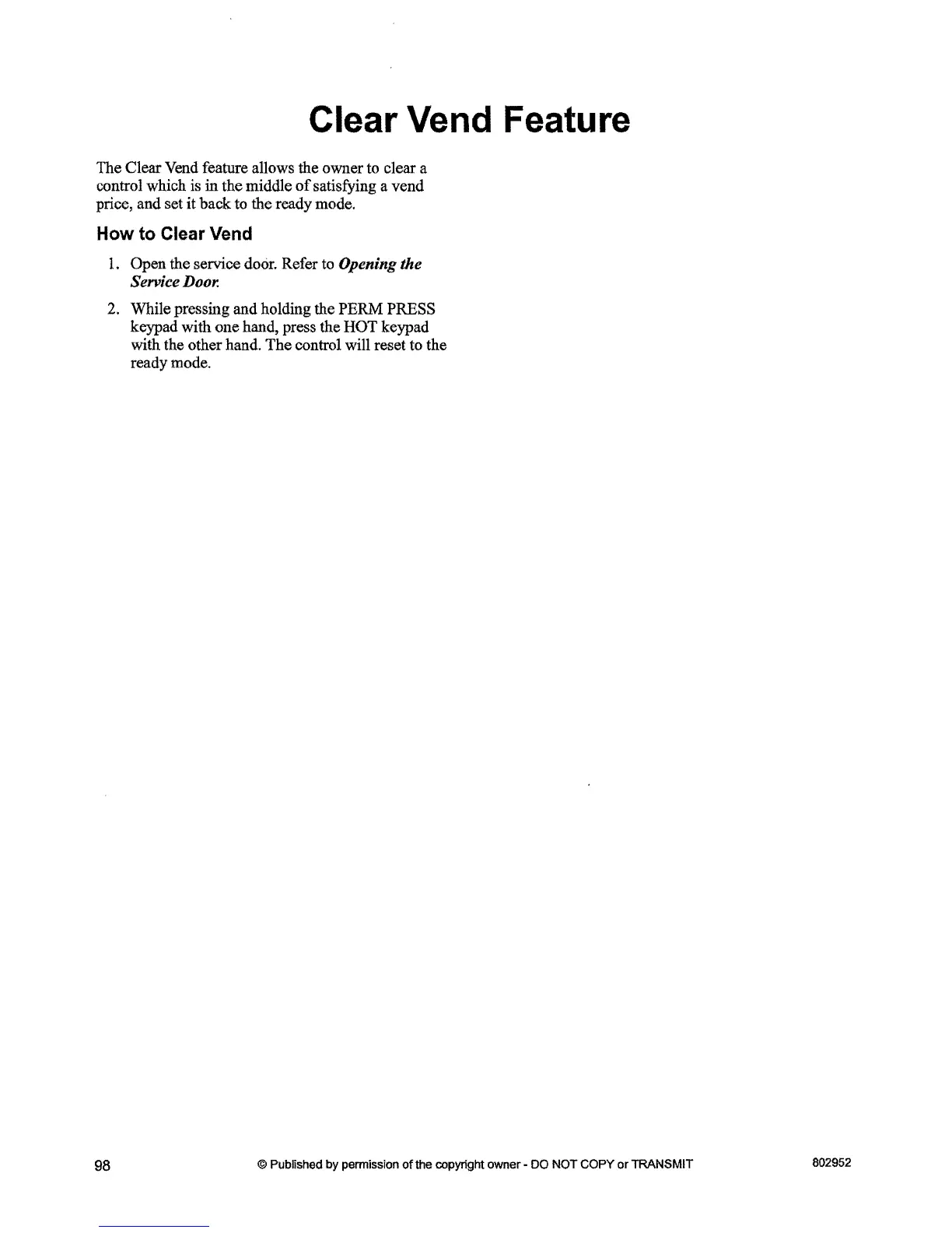 The Clear Vend feature allows the owner to clear a