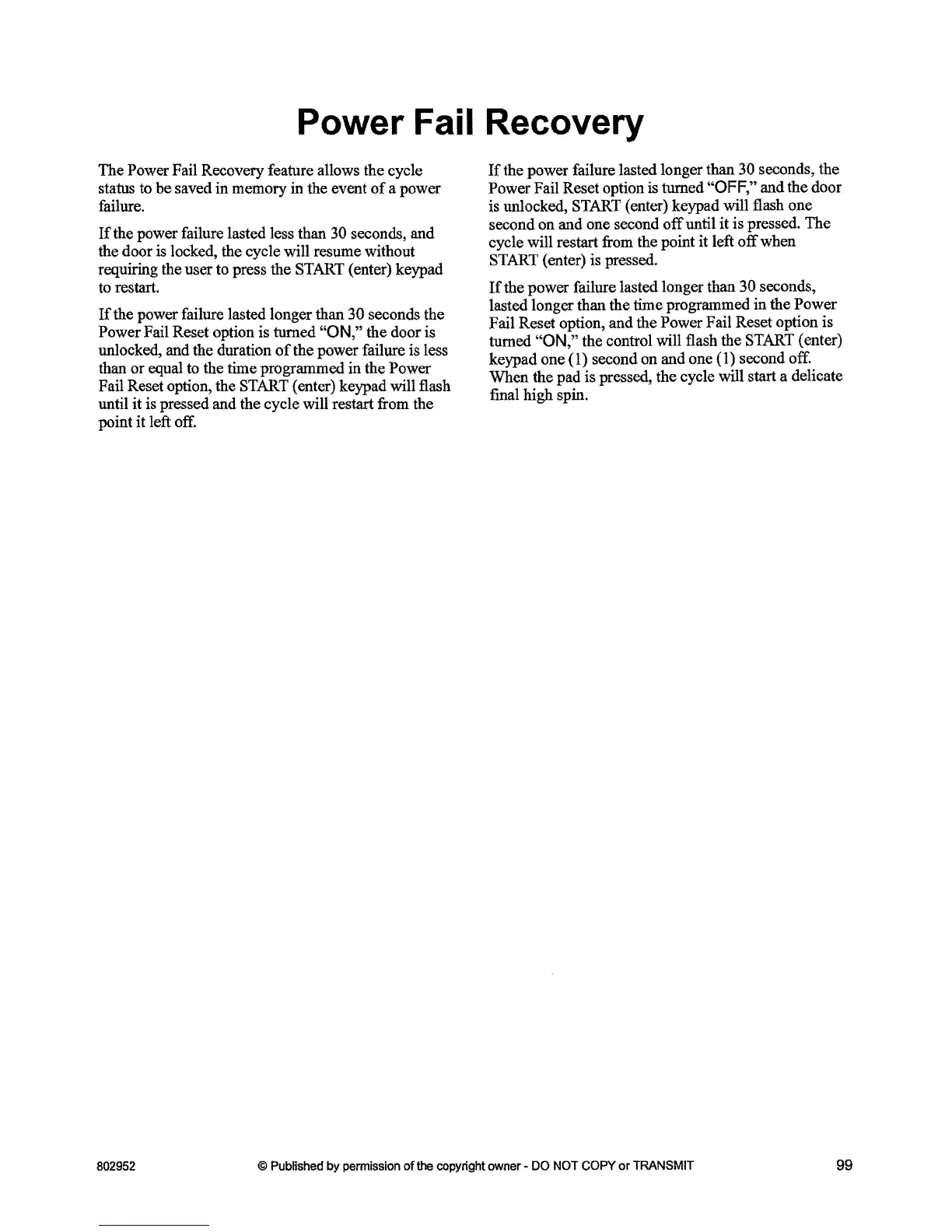 The Power Fail Recovery feature allows the cycle