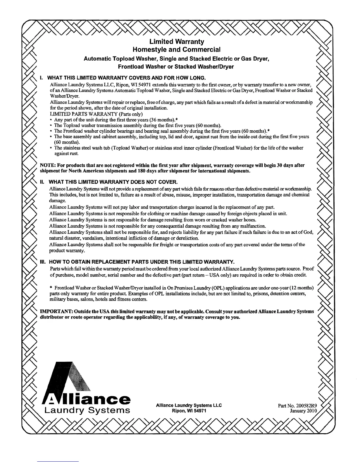 Alliance Laundry Systems LLC, Ripon, WI 54911 extends this warranty to the first owner,