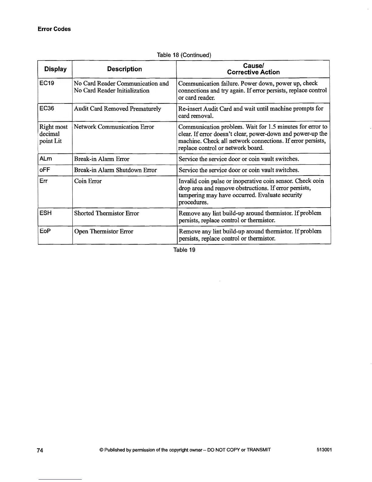 Break-in Alarm Shutdown Error Service the service door or coin vault switches.