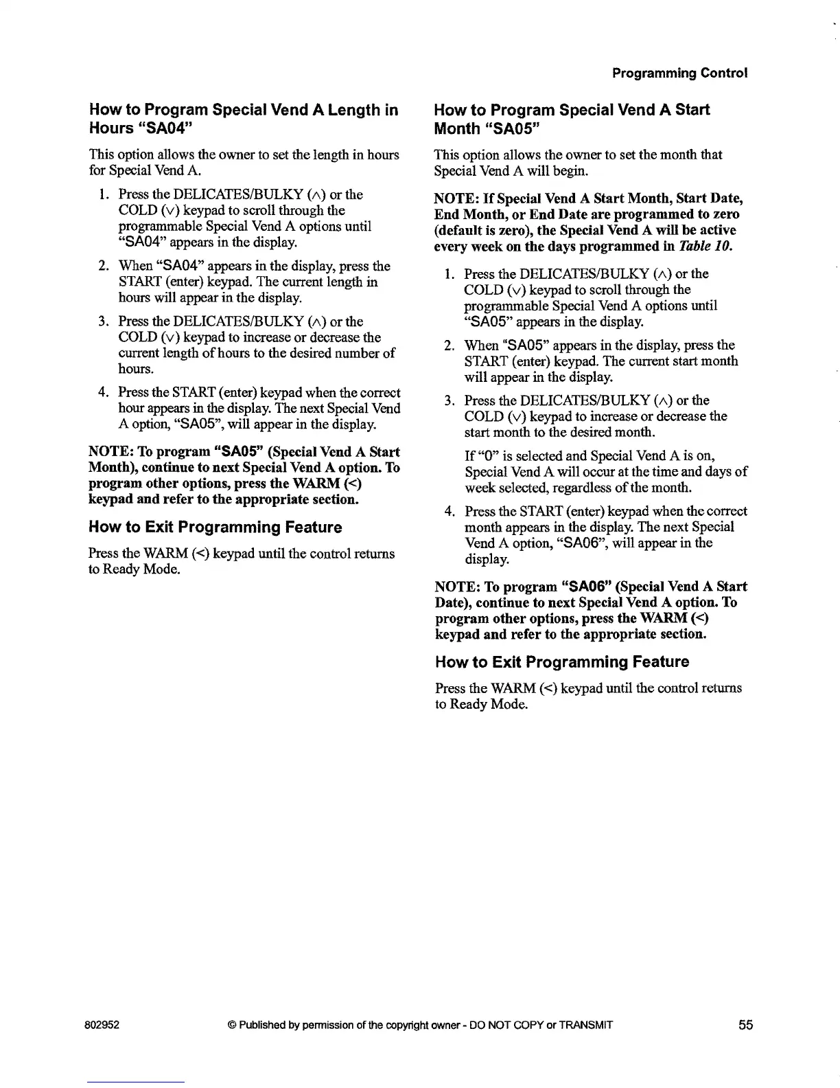 programmable Special Vend A options until