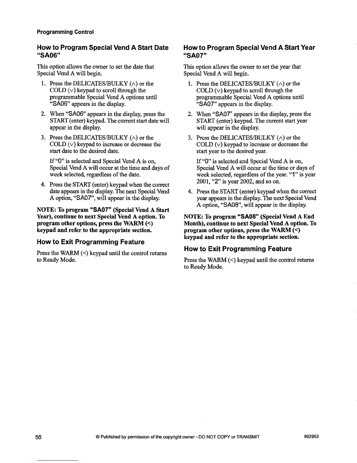 year appears in the display. The next Special Vend