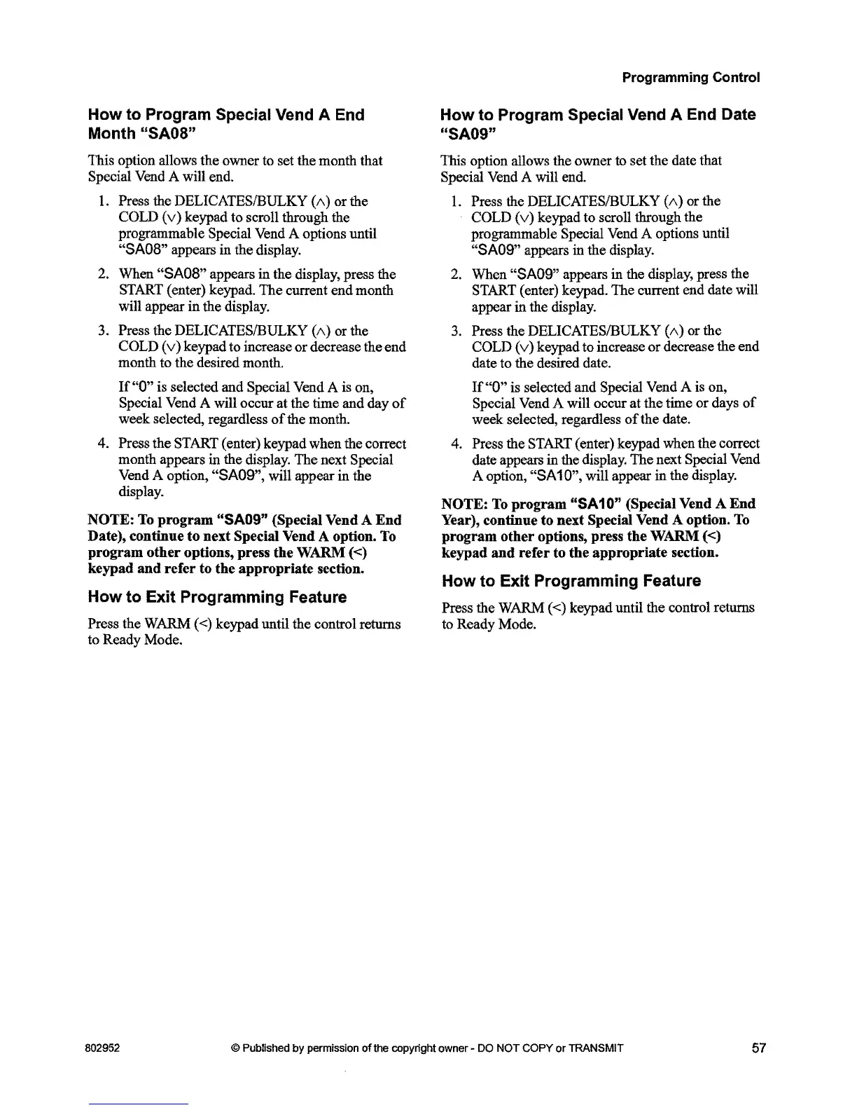 program "SA09" (Special Vend A