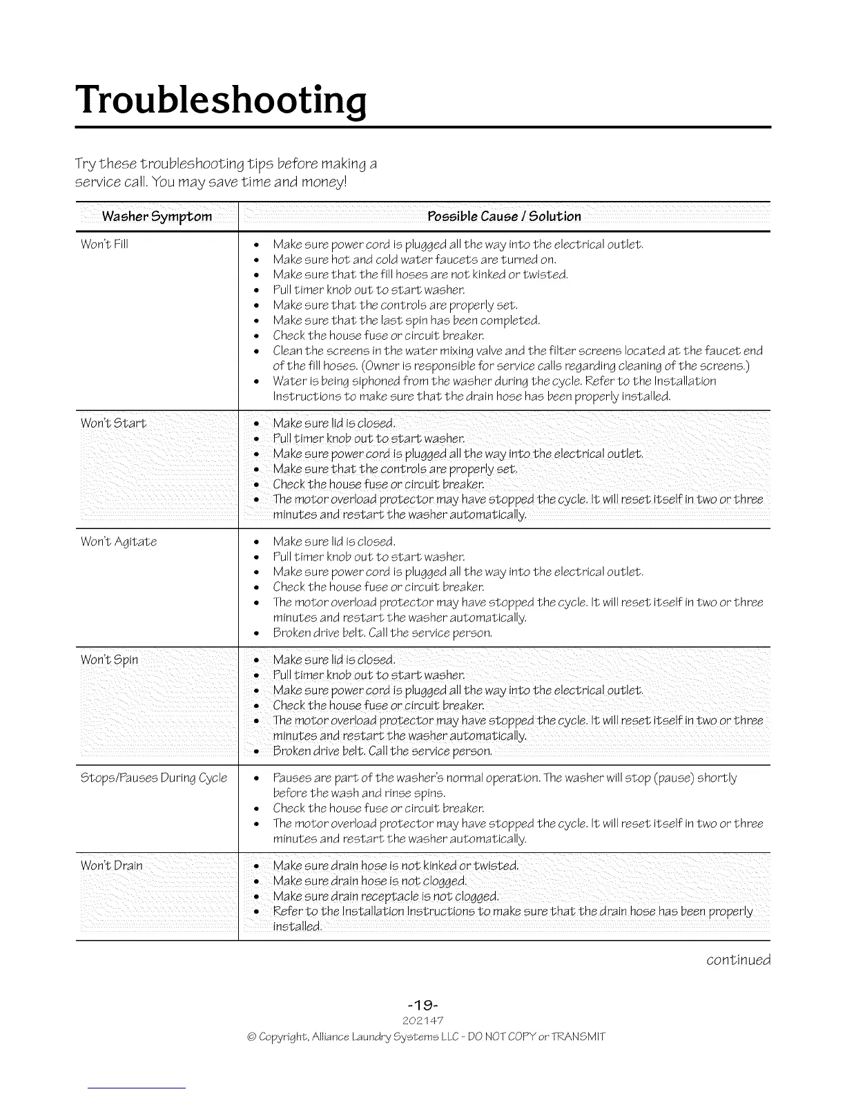 Washer Symptom Possible Cause / Solution