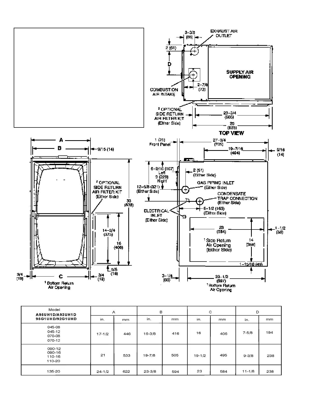 A95UH1D, A93UH1D, 95G1UHD & 92G1UHD Unit Dimensions - inches (mm)