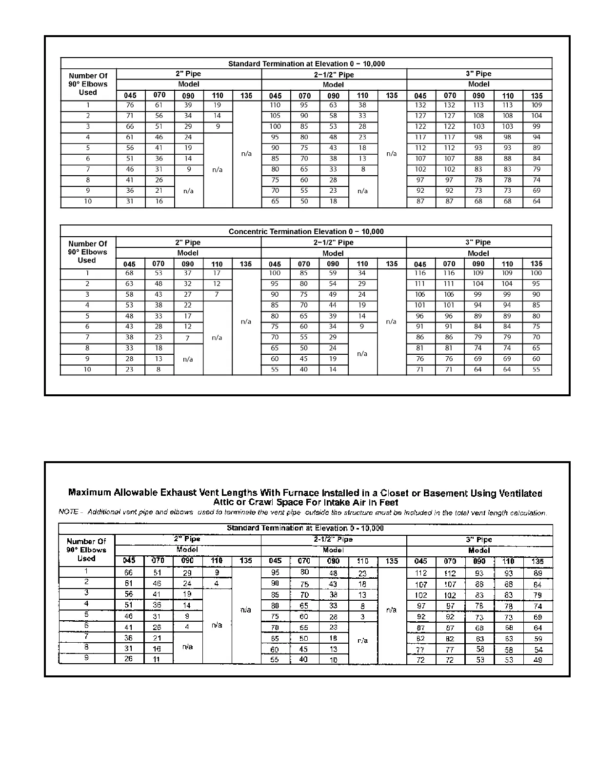 A93UH1D and 92G1UH-P Maximum Allowable Intake or Exhaust Vent Length in Feet