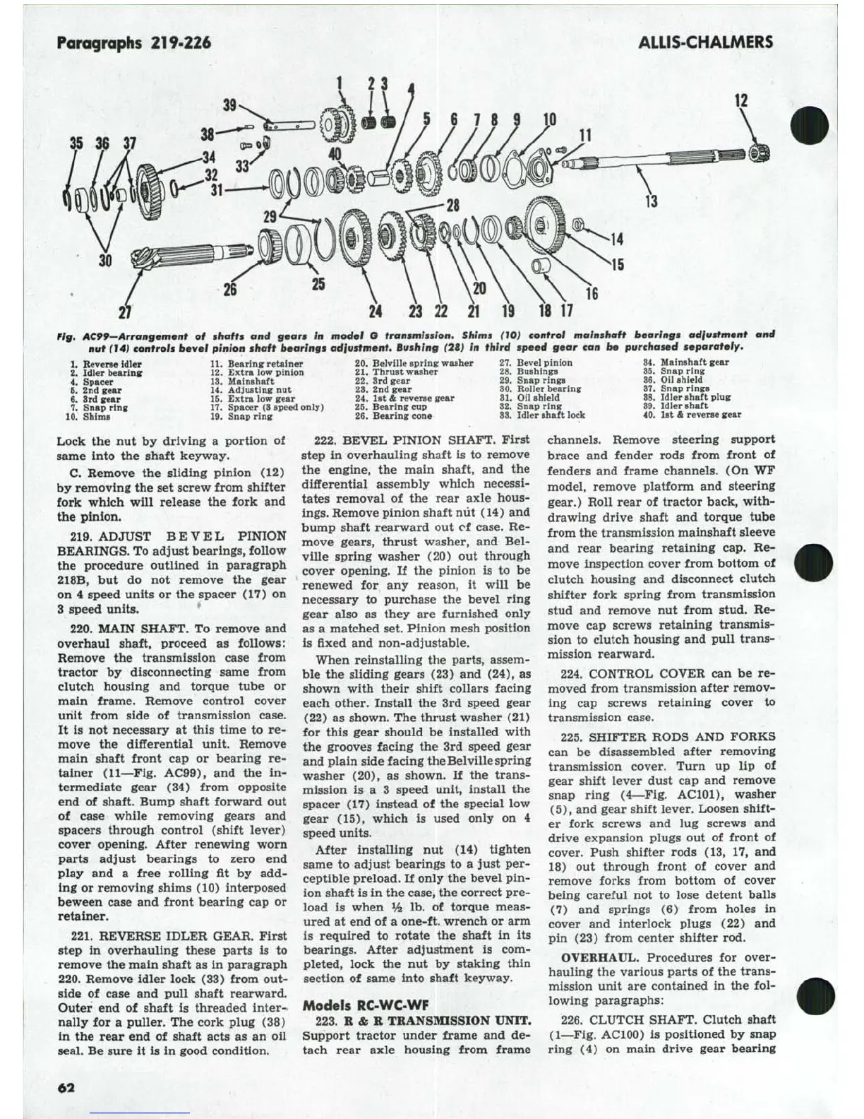 Pig, AC99-Arrangement of shafts and gears In model O transmission. Shims (10} control mainshaft bearings adiustment and