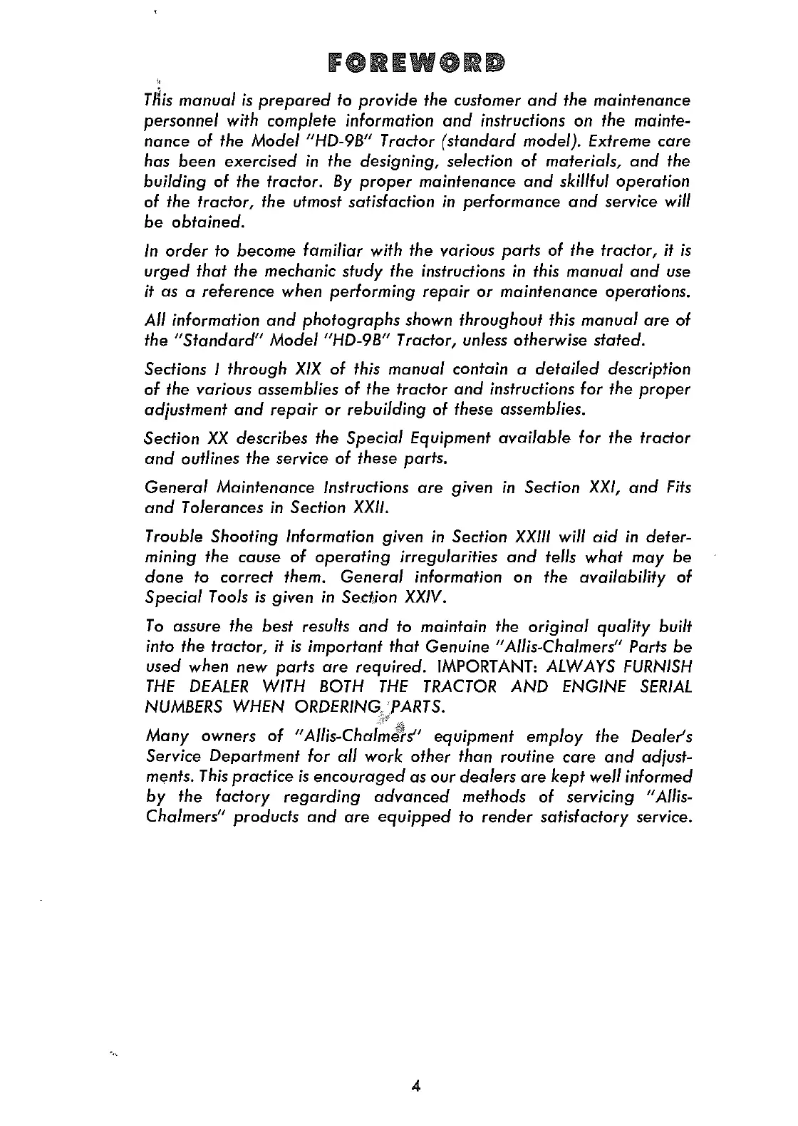 nance of the Model "HD-9B" Tractor (standard model). Extreme care