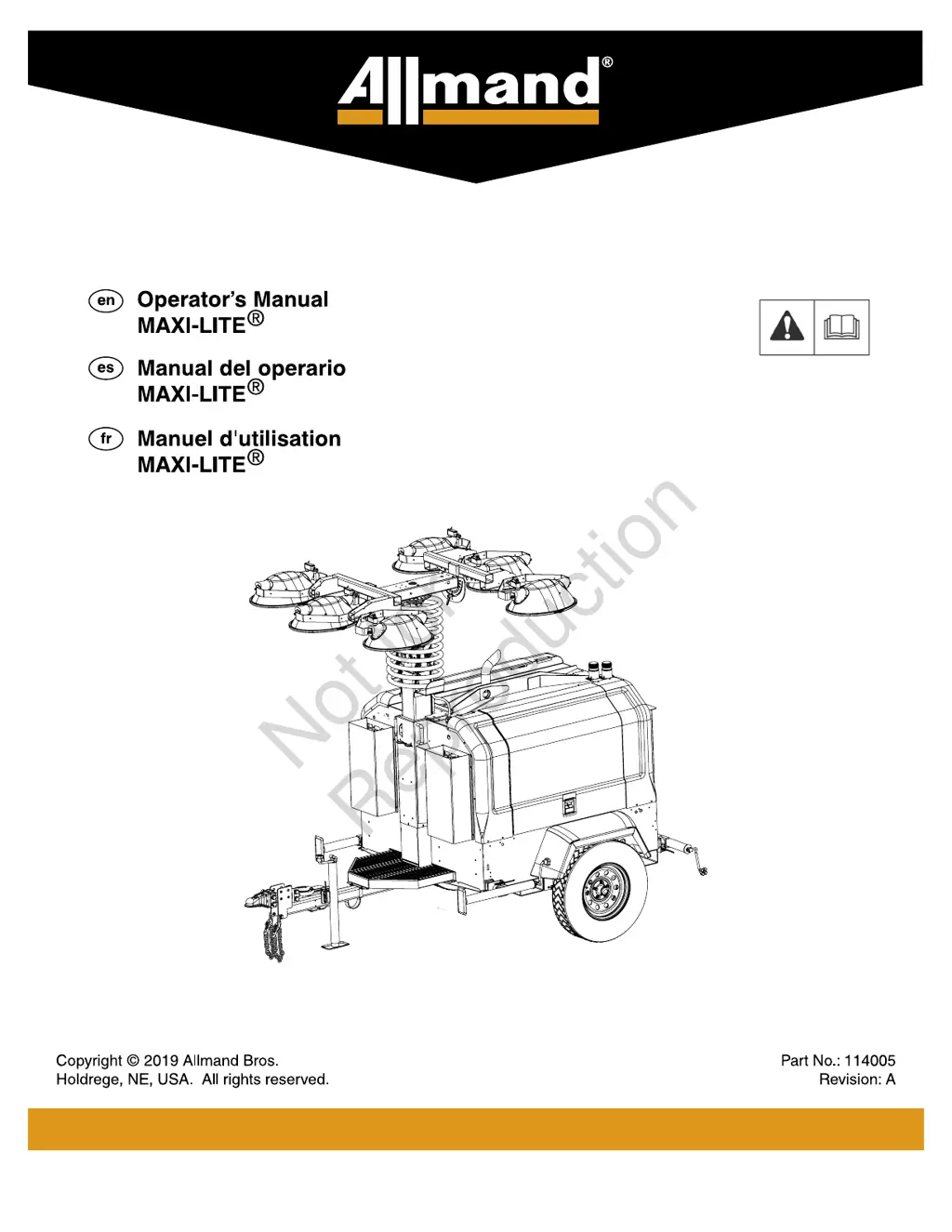 If the Allmand Lighting Equipment lights are not working, start by checking the breakers in the outlet box to ensure they are turned on or have not tripped. Reset them if necessary. Also, make sure the lamps are screwed in tightly and are not burned out or broken; replace them if needed. Remove any excessive load from the auxiliary outlets.