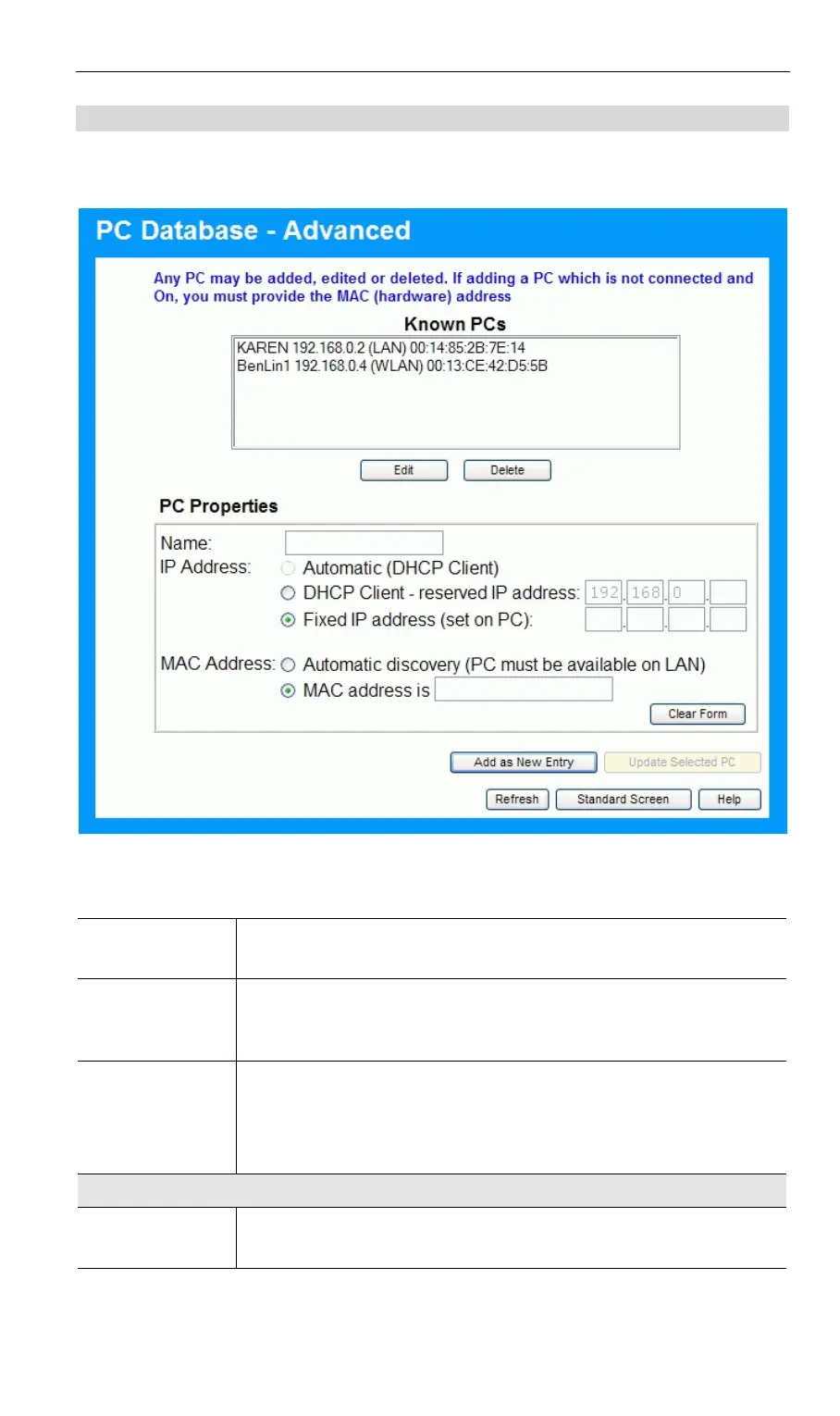 This screen is displayed if the "Advanced " button on the PC Database is clicked. It provides