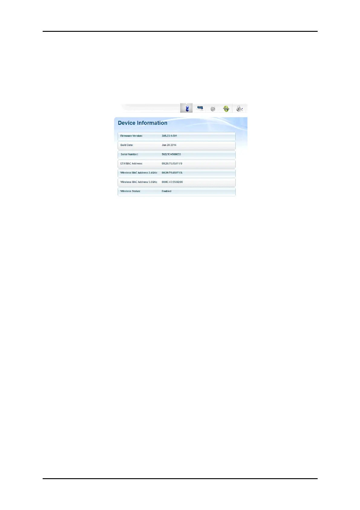• ETH/Bridge and Wireless MAC address. Shows the MAC address of the