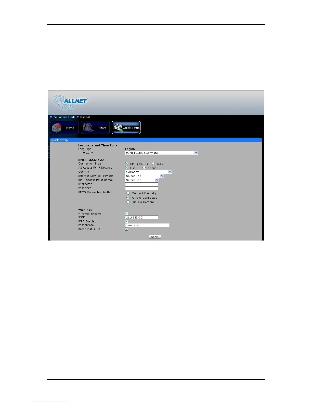 between UMTS (3.5G) and WAN connection. Configure the settings then click the Apply button for the