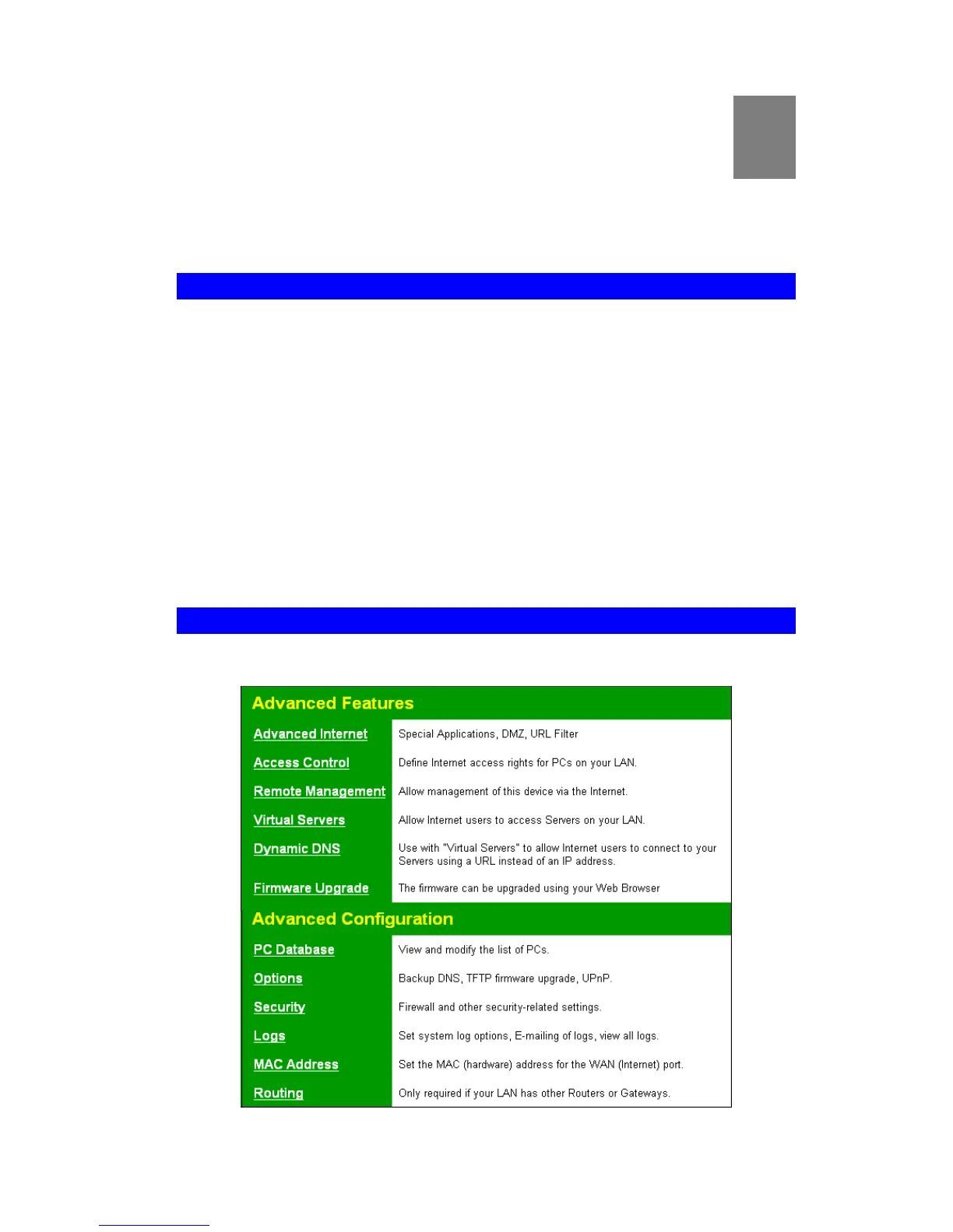 This Chapter explains when and how to use the Wireless Router's "Advanced"