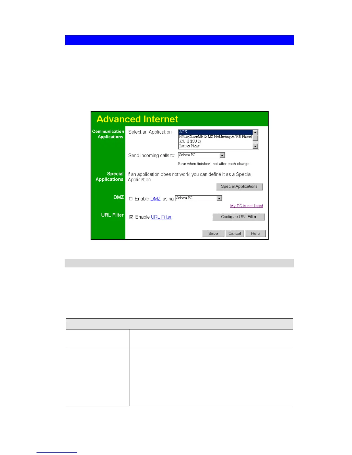 This screen allows configuration of all advanced features relating to Internet access.