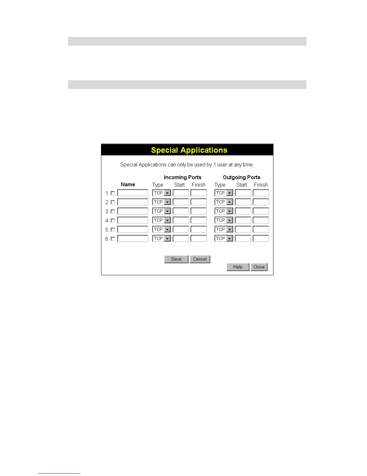 This screen can be reached by clicking the Special Applications button on the Internet screen.