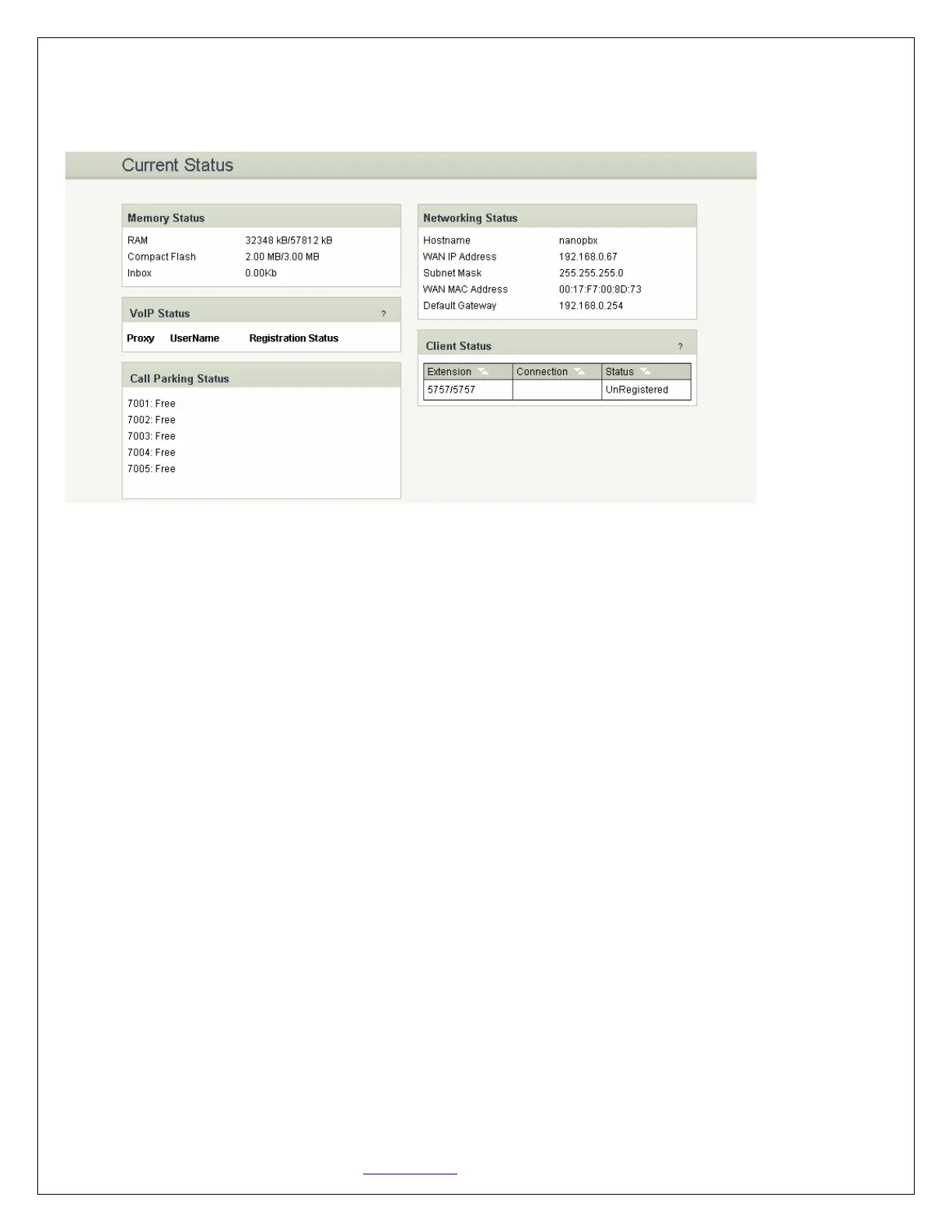 • Under “Client Status” you will see all the users and the extensions connected to the NanoPBX. Also