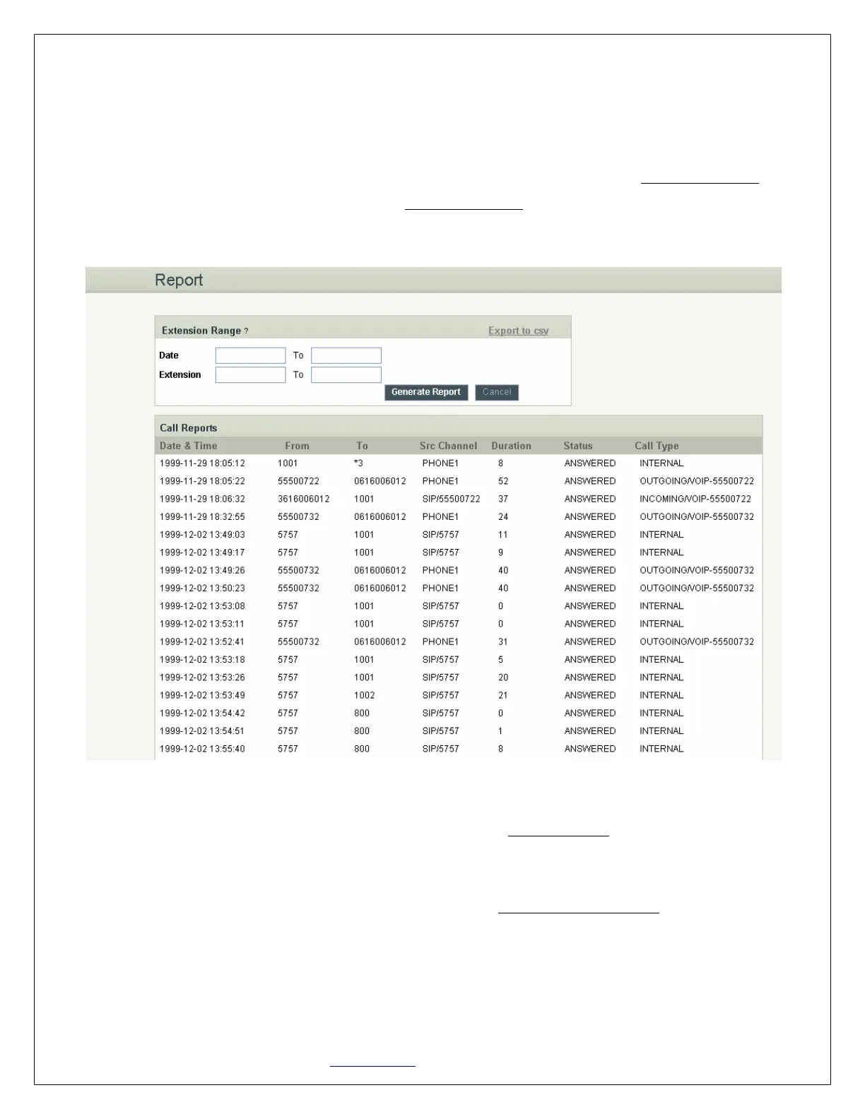 To view all the records in NanoPBX simply click Generate Report. A list with call details will display in the
