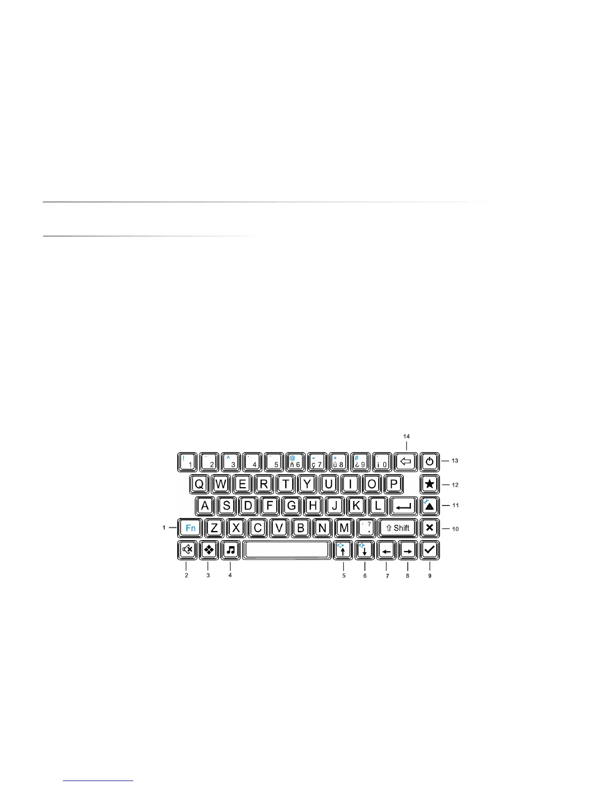 frequently used special characters (shown in blue), a function key Fn, one Shift key, an Enter key and a number of control keys.