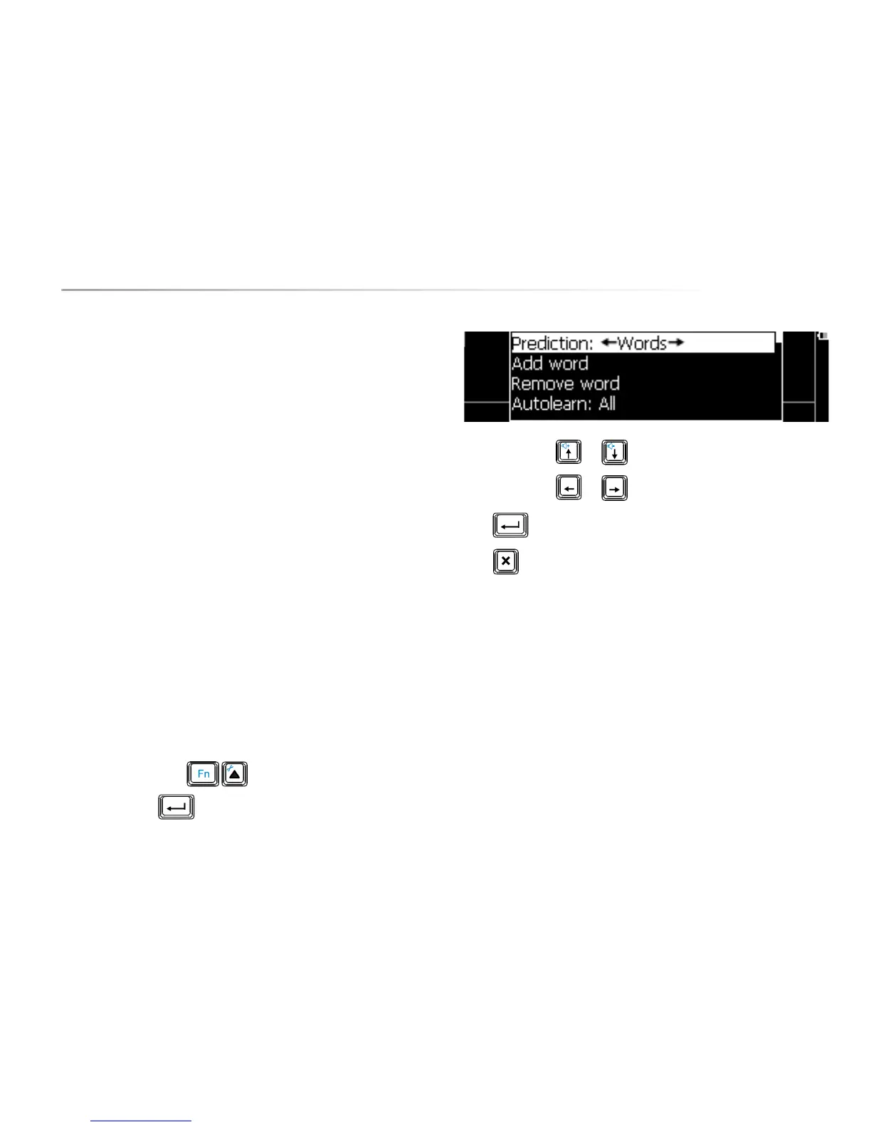 In word prediction the Allora will predict a maximum of 5 words. Press figure key