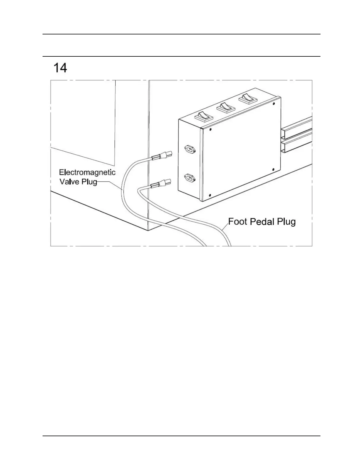 14. Plug the Electromagnetic Valve Plug and Foot Pedal Plug into the