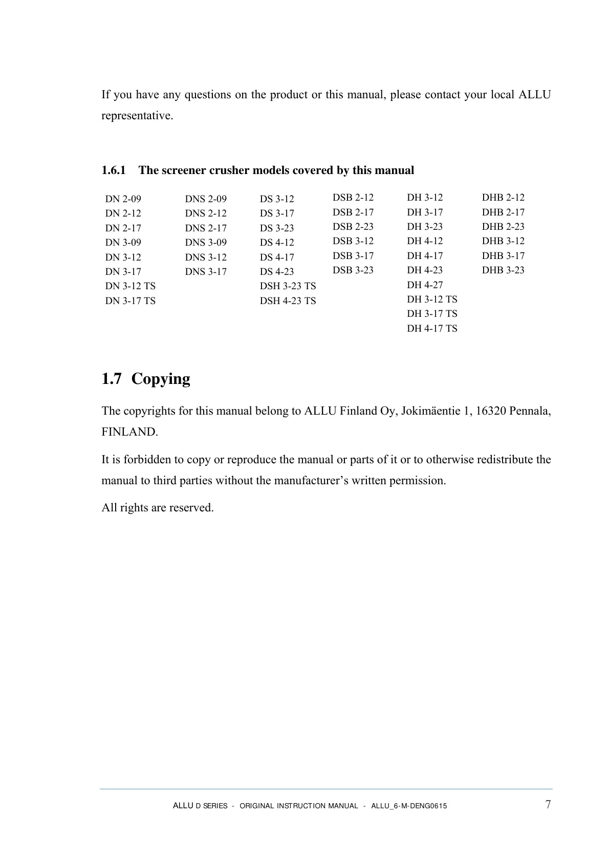 The copyrights for this manual belong to ALLU Finland Oy, Jokimäentie 1, 16320 Pennala,