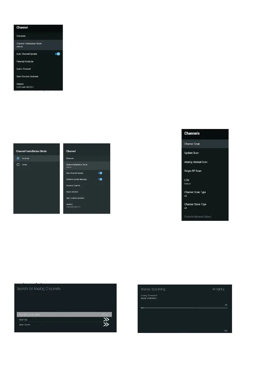 Channels: Display the scan sub-menu based on different channel installation modes.